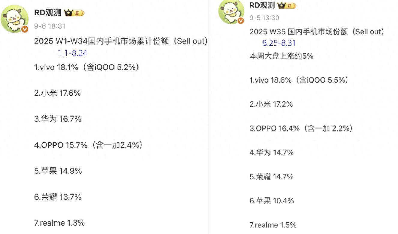 2025年国内手机排行榜更新:苹果第五华为第三第一名意料之中