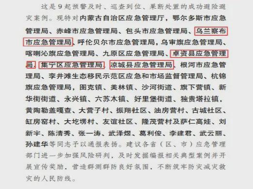 此次通报表扬,是对乌兰察布市基层应急能力建设和防灾减灾工作的充分肯定,也为今后汛期的防灾减灾工作增添了信心和动力。
