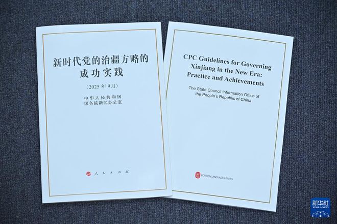 9月19日,国务院新闻办公室在北京举行新闻发布会,发布《新时代党的治疆方略的成功实践》白皮书,中央宣传部副部长王纲,新疆尔自治区党委副书记、自治区主席艾尔肯·吐尼亚孜,新疆尔自治区党委常委、自治区常务副主席陈伟俊,新疆尔自治区党委常委、宣传部部长王建新出席,介绍白皮书有关情况并答记者问。这是《新时代党的治疆方略的成功实践》白皮书。 新华社记者 李鑫 摄