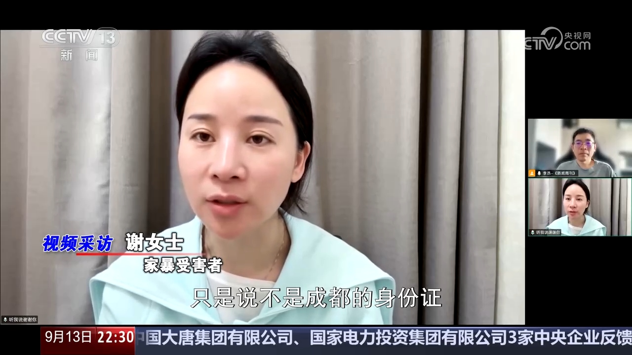 家暴受害者 谢女士:工作人员跟我说,只是出示我的居住证明没有用,必须还要提供对方的身份证明,就是身份证、户口本。当时我是提供了贺某阳的身份证复印件的,是有效期的身份证,只是不是成都的身份证,然后工作人员就说不行。